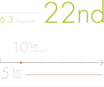 On 22 February 2011, a large aftershock of 6.3 magnitude occurred on a busy weekday at lunchtime. Striking at 12.51pm, it was centred 10km south-east of Christchurch in Lyttelton, at a depth of just 5km. Although officially lower on the scale than the first earthquake, due to the shallowness and proximity of the epicentre to the city, this aftershock was the strongest ever recorded in an urban area, anywhere in New Zealand.