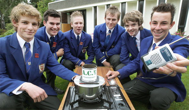 Six Christchurch secondary pupils have created a device that uses a pot of boiling water to charge cellphones, power a light and run a radio.